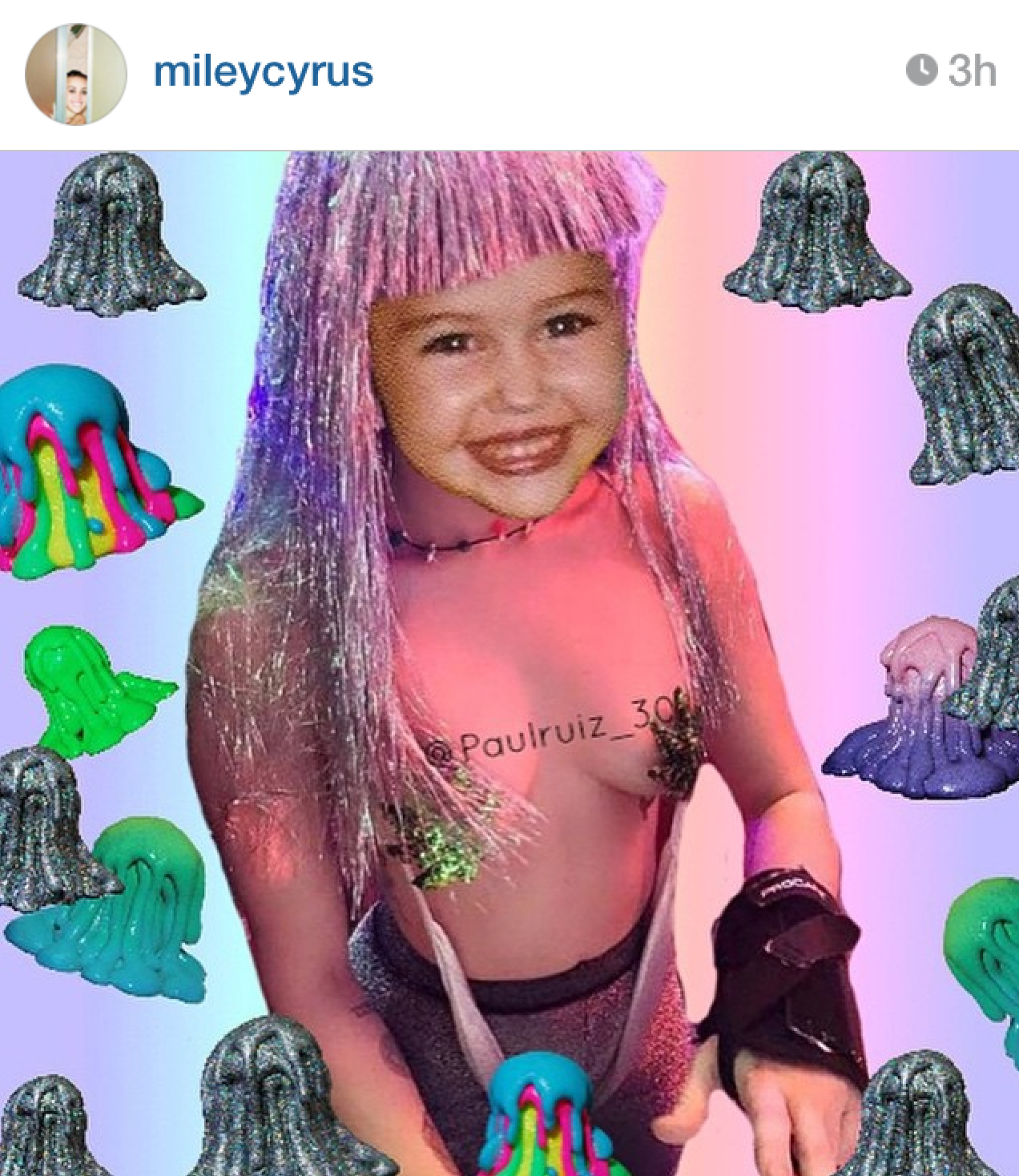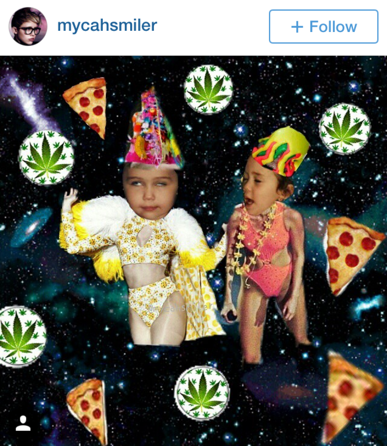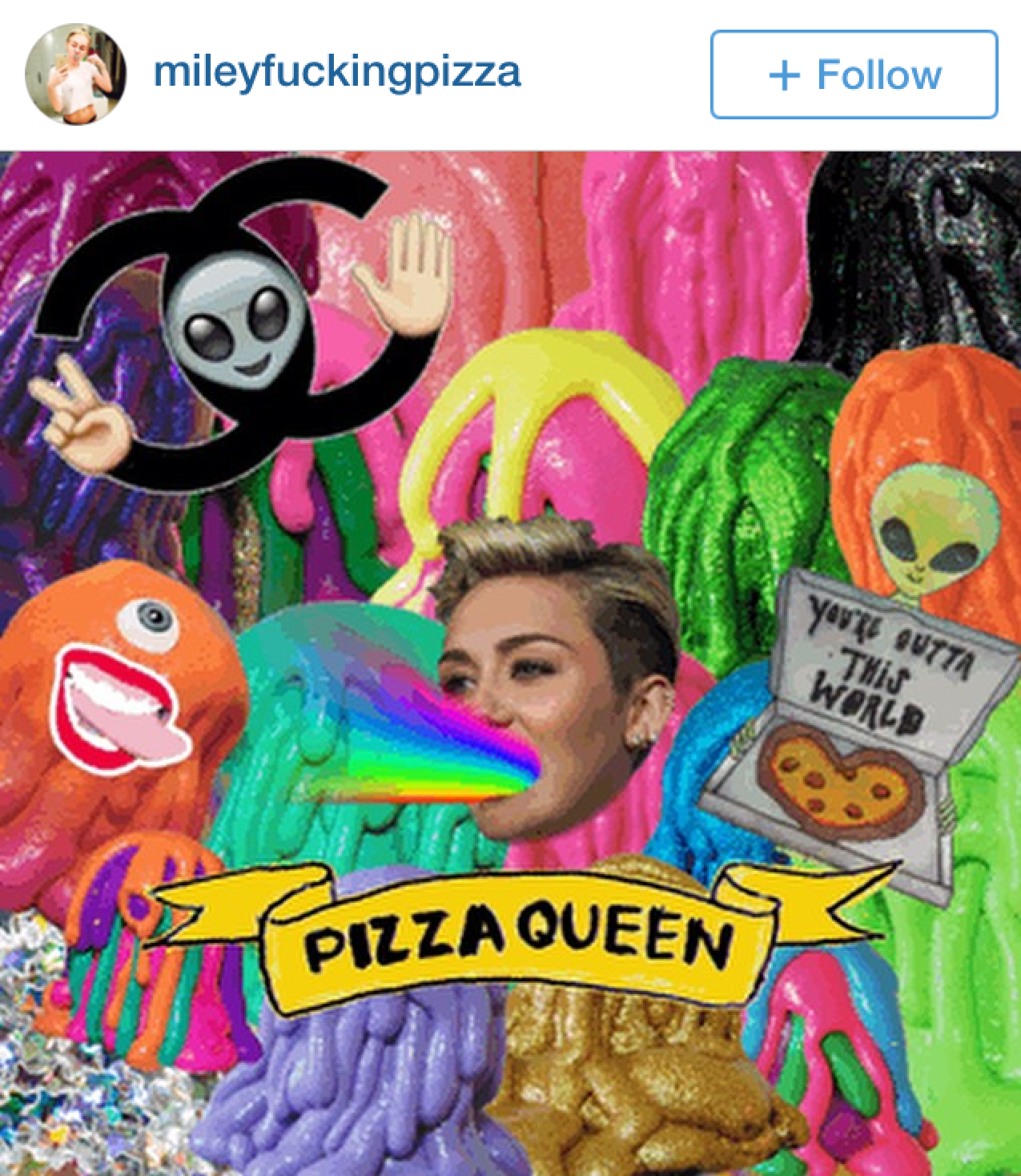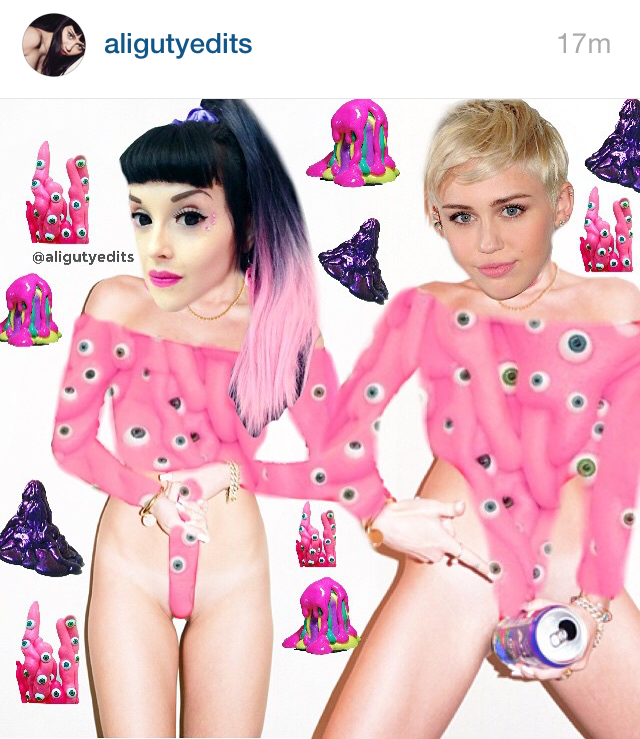 Then, there was this amazing symbiotic thing that would happen. Miley would post, and her fans - ‘smilers’ - would make ‘edits’. They’d include things they knew she liked, references to her visual world at the time - it was all a kind of hodgepodge, maximalist, 2010’s post-Internet, seapunk-adjacent, weed-pizza-unicornpoolfloat-core aesthetic. Collages made quickly with apps. Stickers, gifs, acid smileys. She would sometimes post her favourites, so she would get tagged in hundreds of them. My work - and later my face - would appear in these remixes too. This was both amazing and disturbing to me - my work so far removed from it’s original form that it was truly something else entirely. It was a fan culture meme now, eaten and regurgitated a hundred times over.
