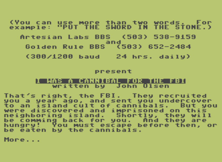It seems absurd that something like I Was a Cannibal for the FBI could have made such a lasting impression on me that I still thought about it thirty years later. Of course, games like this feel simplistic and dated now, relics from an innocent time. You really have to adjust to a slower and less dopamine-driven mode of engagement to enjoy them.