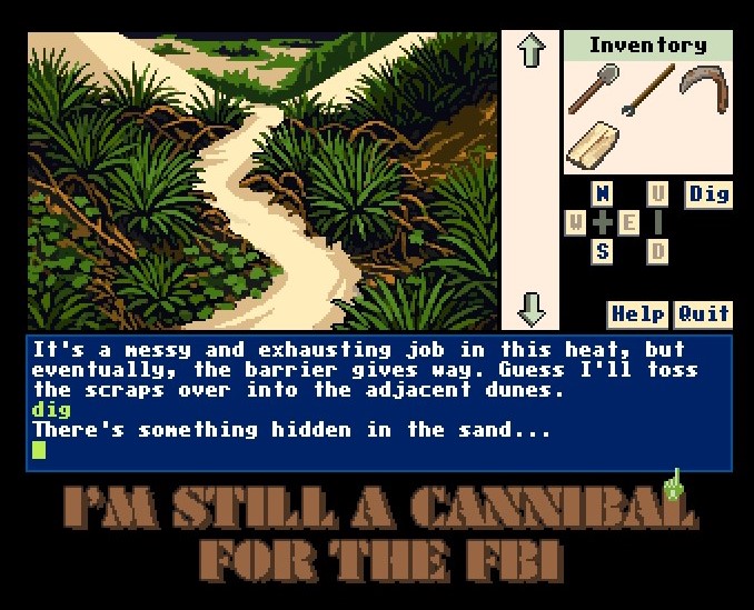You’d be forgiven for finding the game itself underwhelming, given the title. It’s a very short puzzle game. You are an agent working for the FBI. You wake up on an island. You have a certain number of turns to figure out how to escape before the cannibals find you and boil you in a big pot. The first iteration of the game was made in the 80s. For now, let’s try our best to overlook the, er, uncomfortable colonial overtones and ‘savage native’ stuff. It was aiming for something pulpy and camp.